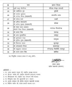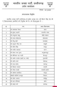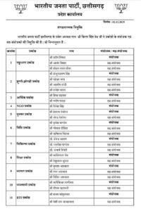भारतीय जनता पार्टी में संगठनात्मक नियुक्तियां, प्रदेशाध्यक्ष किरणसिंह देव ने की नियुक्ति, विधानसभा प्रभारी, जिला संगठन प्रभारी-सह प्रभारी, प्रकोष्ठ के संयोजक और सहसंयोजक की लिस्ट भी जारी, देखिए पूरी सूची…