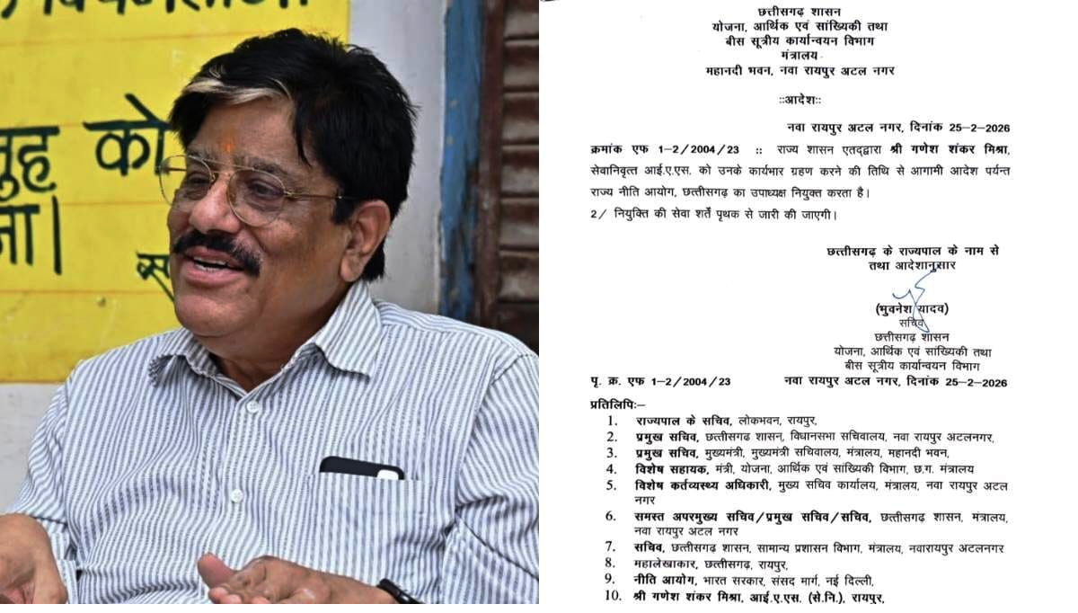 रायपुर/छत्तीसगढ़ सरकार ने एक महत्वपूर्ण प्रशासनिक निर्णय लेते हुए सेवानिवृत्त आईएएस अधिकारी गणेश शंकर मिश्रा को राज्य नीति आयोग, छत्तीसगढ़ का नया उपाध्यक्ष नियुक्त किया है। उनकी नियुक्ति को लेकर योजना, आर्थिक एवं सांख्यिकी तथा बीस सूत्रीय कार्यक्रम कार्यान्वयन विभाग की ओर से आधिकारिक आदेश जारी कर दिया गया है।